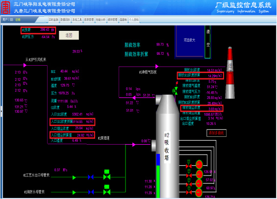 三门峡华阳发电有限公司2x320MW机组烟气超低排放改造工程是我公司第一个脱硫脱硝除尘超低排放项目,该项目采用我司自主设计的双托盘+高效除雾器脱硫除尘一体化技术,在锅炉100%BMCR工况下,吸收塔入口粉尘和SO2浓度分别为24mg/Nm³和5200mg/Nm³,出口排放浓度分别为粉尘<3mg/Nm³和SO2<14mg/Nm³。